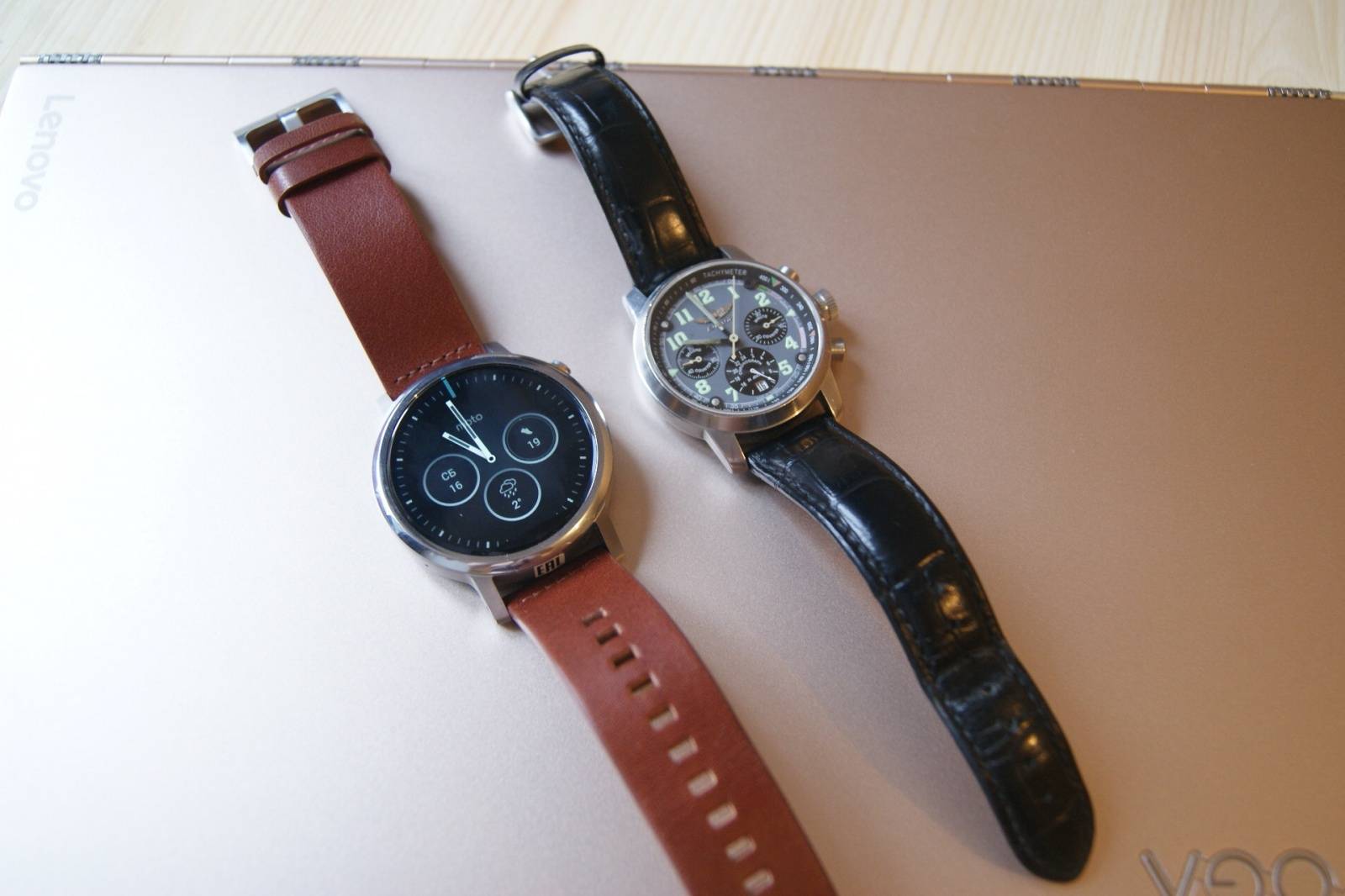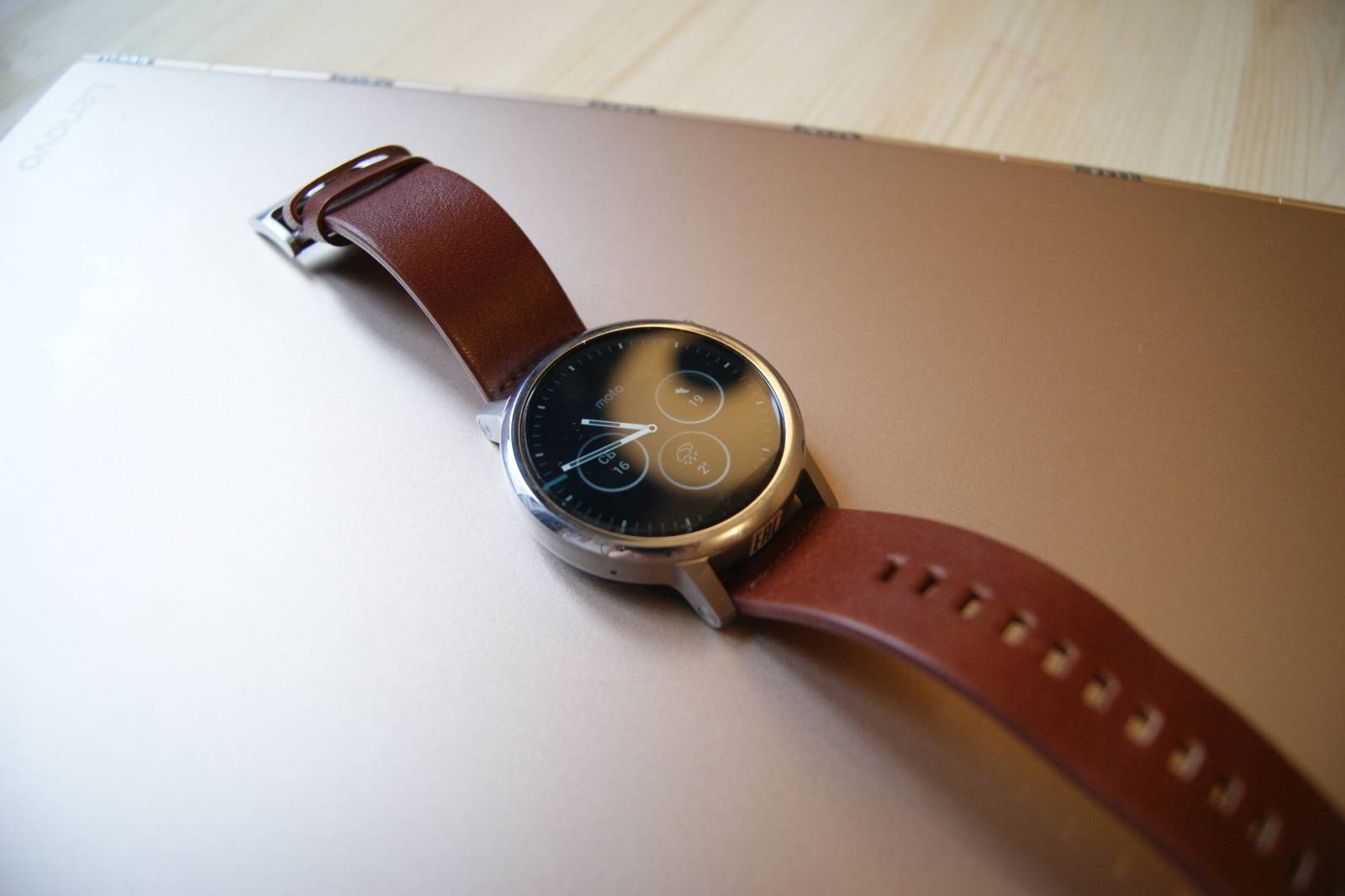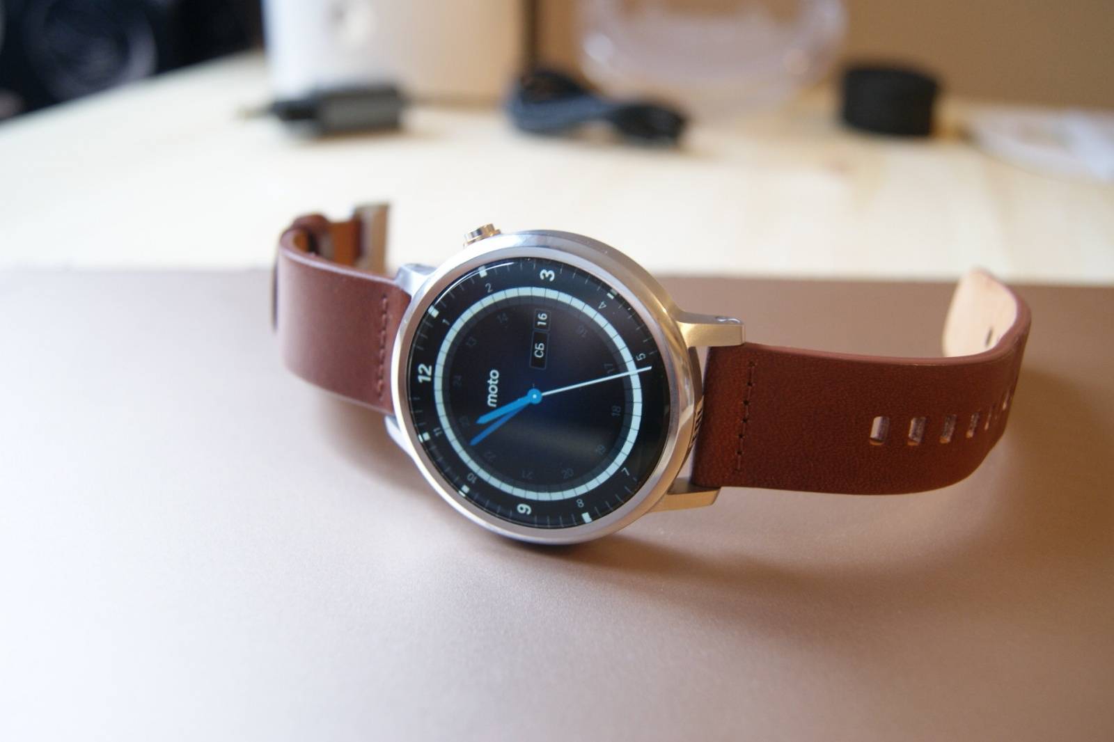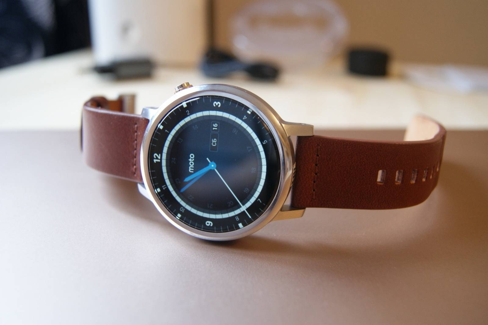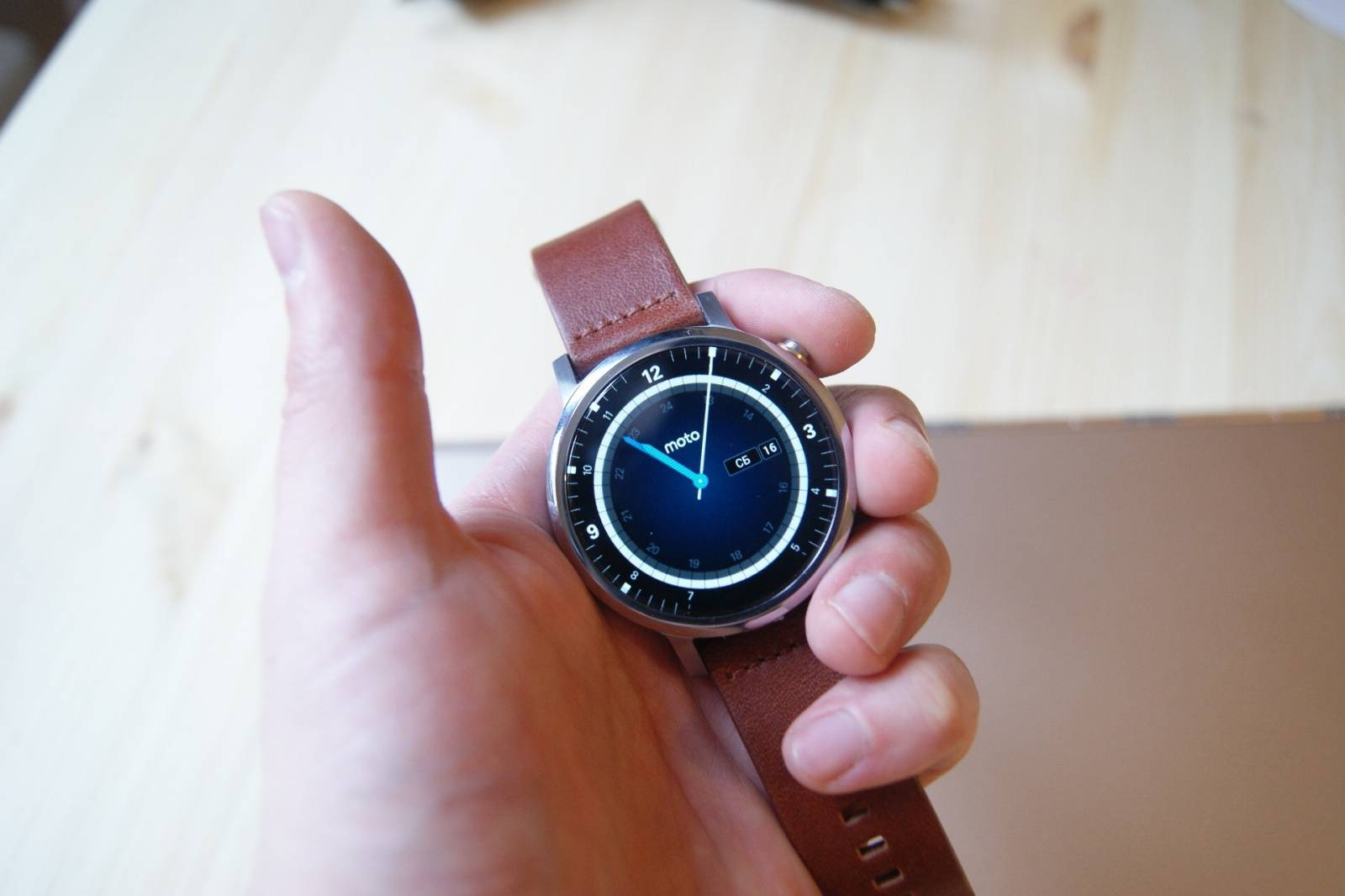 Компании Motorola первой удалось разработать круглый дизайн циферблата «умных» часов для Android Wear. Теперь можно заметить присутствие наконечников, в то время как раньше ремень легко был вписан в корпус. Хотя технически за счет этого увеличивается корпус, девайс по-прежнему может похвастаться высокими показателями прочности дисплея среди остальных смарт-часов во многом благодаря тонкому выступу закаленного стекла над циферблатом.