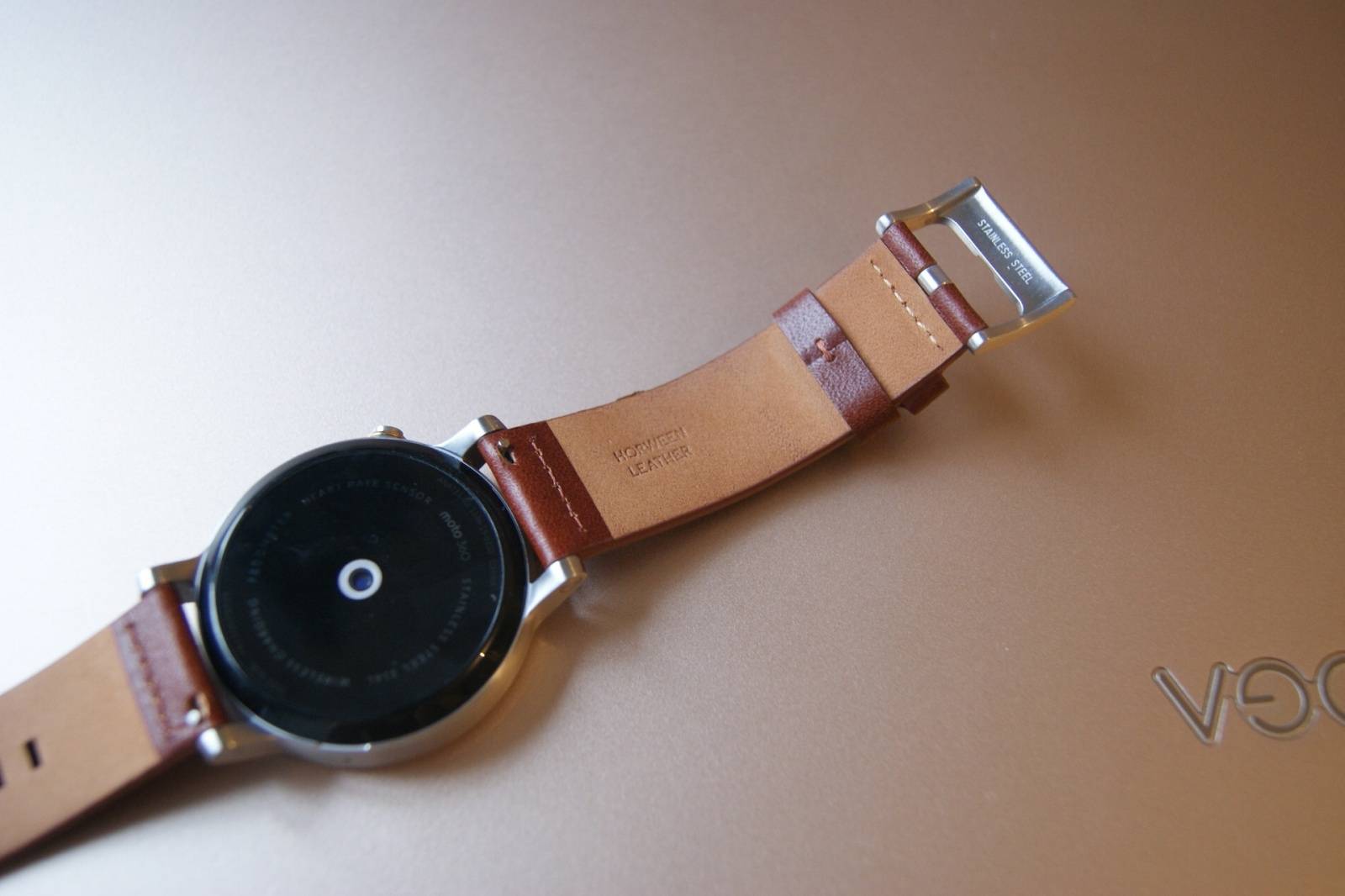 На обратной стороне корпуса интегрирован оптический пульсометр, который измеряет частоту сердцебиения каждые 5 минут. Слева расположен микрофон, а справа – кнопка, которая отвечает за включения устройства и переход на главный экран. не снабжены ни одним разъёмом. Устройство заряжается индукционным методом, а передача файлов выполняется по протоколу ADB. Благодаря отсутствию разъёмов мото 360 имеют значительное преимущество – они защищены от кратковременного погружения под воду.
