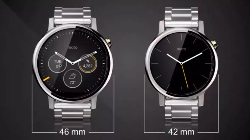 Moto выпустила часы в двух калибрах — 42 и 46 миллиметров. Версия с 42 мм имеет два варианта ремешков — тонкий и широкий. Сами ремешки можно легко менять с помощью защёлки.