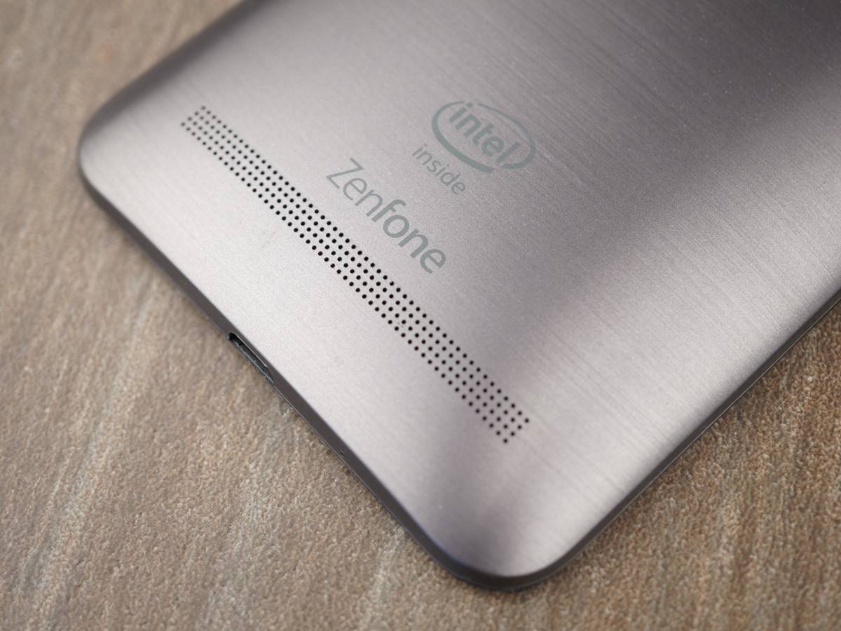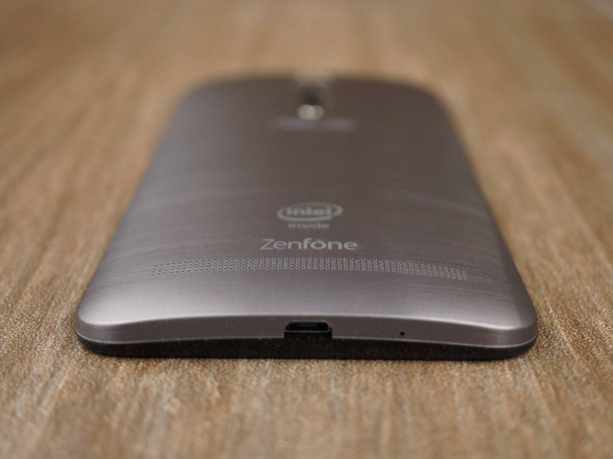 Обратная сторона девайса представлена выпуклой крышкой, которая отличается от современных моделей. Сегодня почти все задние панели ровные, и небольшие скосы находятся ближе к торцам. У Zenfone 2 вся крышка выпуклая, и за счет это он кажется массивным. Оформление задней панели выполнено таким образом, что телефон кажется металлическим, но обманываться на этот счет не стоит — корпус сделан из пластика. На нем в центре расположилась камера, вспышка и овальная кнопка регулировки громкости с вертикальным расположением. Для того времени такое положение клавиши было новинкой, и многие пользователи в отзывах указывали на то, что привыкать к ней не очень просто. Также в нижней части задней панели расположен динамик.
