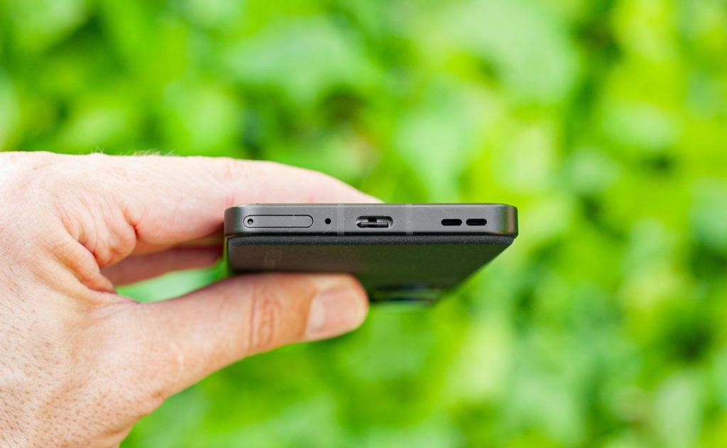 На нижней грани есть слот для двух SIM-карт (для двух нано-SIM-карт, но без места для microSD). Также есть второй микрофон, порт USB-C и один из двух динамиков (еще один находится в прорези над дисплеем).