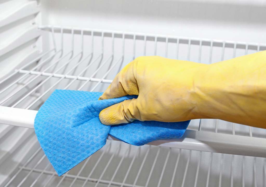 Чтобы почистить холодильник внутри, разведите моющее средство, нанесите его на внутренние поверхности, оставьте на 15-20 минут. Смойте тряпкой, обмакивая ее в чистую воду, а микрофибровой салфеткой вытрите насухо.
