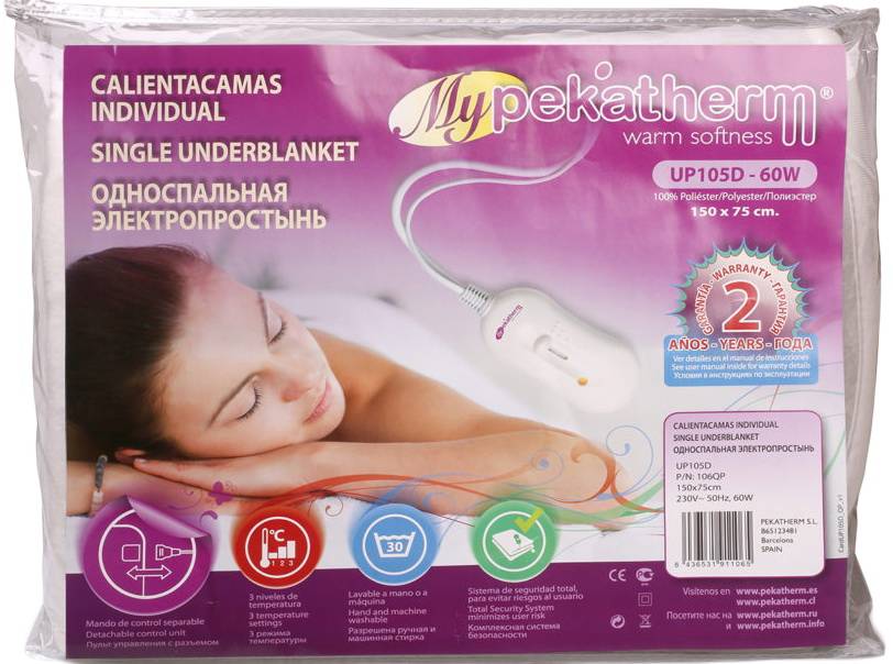 Среди моделей Pekatherm можно найти вполне бюджетные варианты продукции. Например, простынь с подогревом UP105 подойдёт для односпальной и полуторной кровати, позволяет выбирать 1 из 2 режимов работы. Версия U210DF уже более совершенна: в ней есть зональный нагрев, контроль климата, а ещё изделие подходит для деликатной машинной стирки.