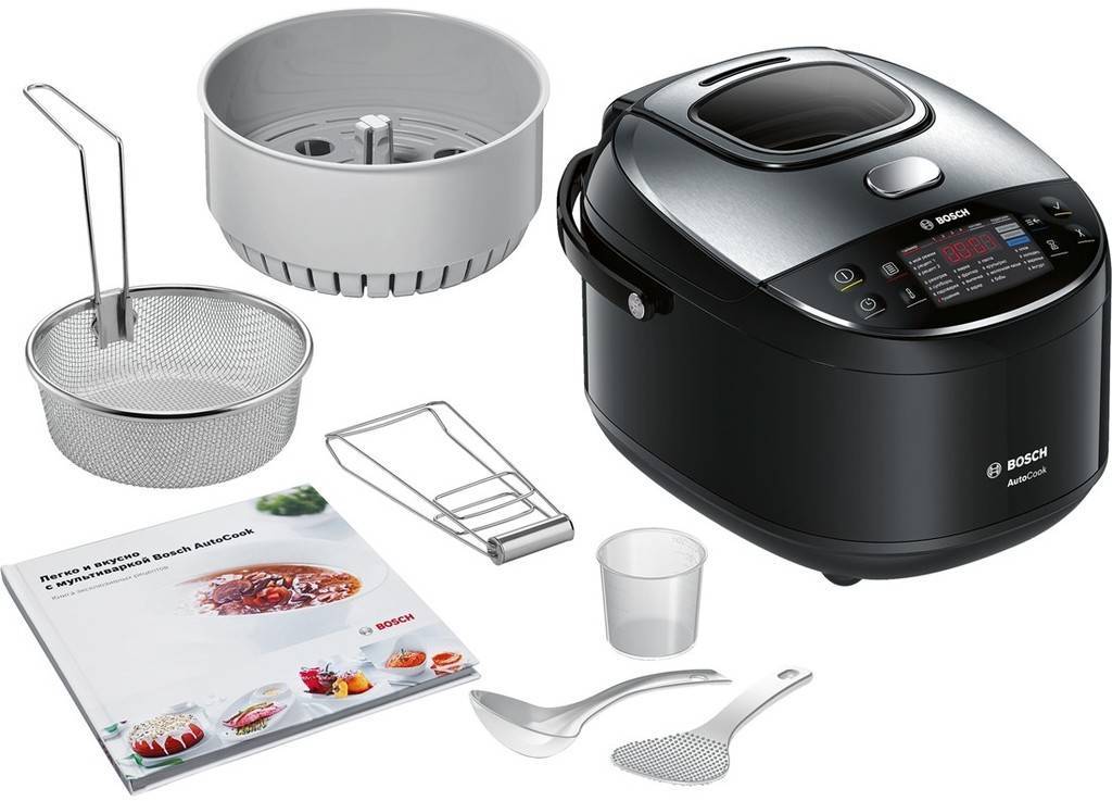 В комплект обычно входят мерный стаканчик, ложки, решетки, книга рецептов.
