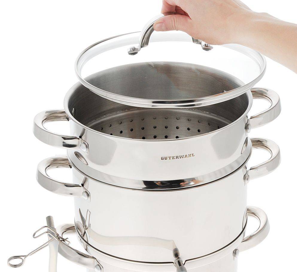 Крышка для кастрюли должна быть металлическая или стеклянная. Для соковарок алюминиевого типа и крышку изготавливают из этого же материала. Для соковарок из нержавейки – из термостойкого стекла. Через прозрачный верх удобно наблюдать за процессом варки. В крышке должно быть отверстие-пароотвод, так верхушка кастрюльки не будет подпрыгивать.