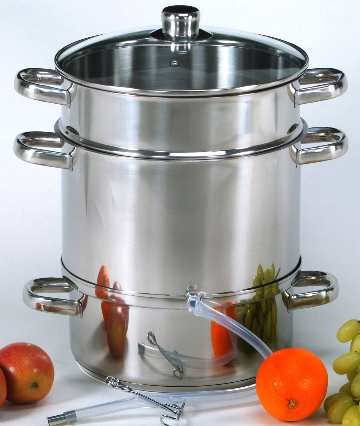 Но самым важным параметром емкости является кастрюля для сбора сока, от ее объёма зависит общее количество фруктового отвара, который получится на выходе.