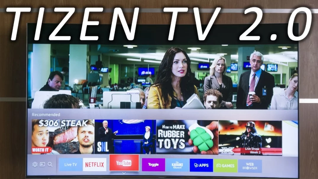 Samsung слишком гигантская корпорация, чтобы пользоваться чужими наработками, поэтому свои Smart TV они выпускают с операционной системой Tizen. Простейший интерфейс и продуманный дизайн оболочки, дают возможность выбирать программу ТВ на нижней части экрана и одновременно просматривать рекомендации в верхнем секторе монитора.