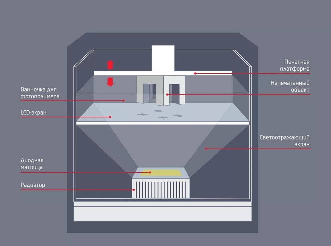 Как и в случае с DLP, LCD‑печать заключается в одновременной засветке целых слоев для отверждения фотополимера, но без применения зеркал. Вместо этого мощные жидкокристаллические панели излучают на модель свет с помощью светодиодов. ЖК‑панель блокирует засветку в тех областях, которые не подлежат фотополимеризации.
