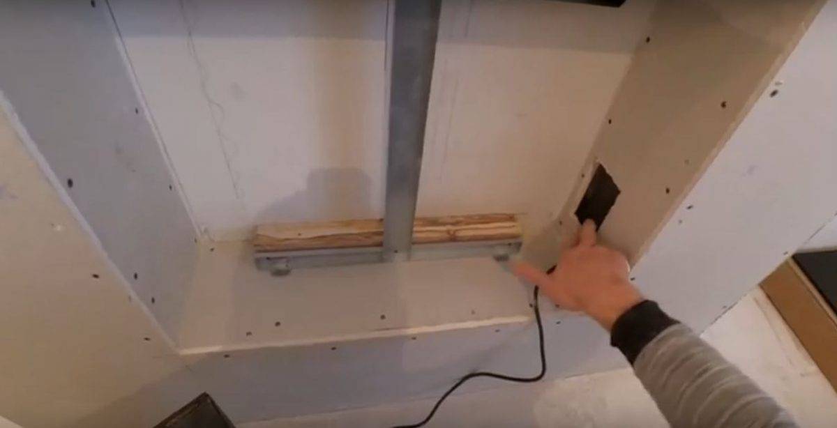 По вышеуказанному принципу создают дымоход (можно обойтись и без него). Обычно он имеет ширину равную порталу, но выступает меньше. Если его используют для навески телевизора, то место фиксации дополнительно усиливают перемычками из профилей.