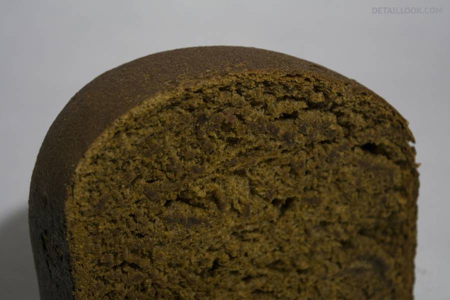 Цвет корочки так же был изменен со среднего на темный. Присутствуют небольшие остатки муки, которые видимо попали с краев формы, нужно было их стряхнуть, прежде, чем устанавливать форму на место. Но, ничего страшного в данном случае они не прилипли и легко стряхнулись с хлеба.