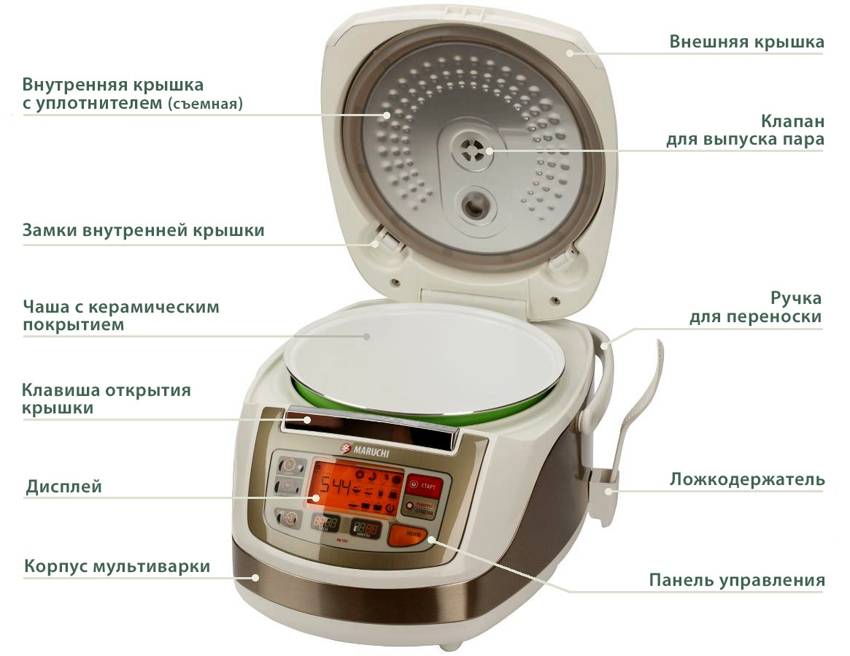 Если внимательно рассмотреть мультиварку, то можно увидеть, что она состоит из чаши, корпуса, крышки, нагревательной части, блока управления.