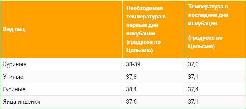 Таблица температурного режима в инкубаторе