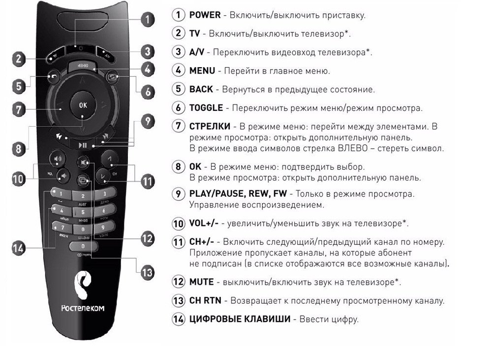 Пульт от Ростелекома является многофункциональным устройством, поэтому ниже подробно расписаны возможности каждой кнопки на нем. Месторасположение кнопок и их нумерация приведены также на нижней картинке, на которой продублированы и функции каждой кнопки.