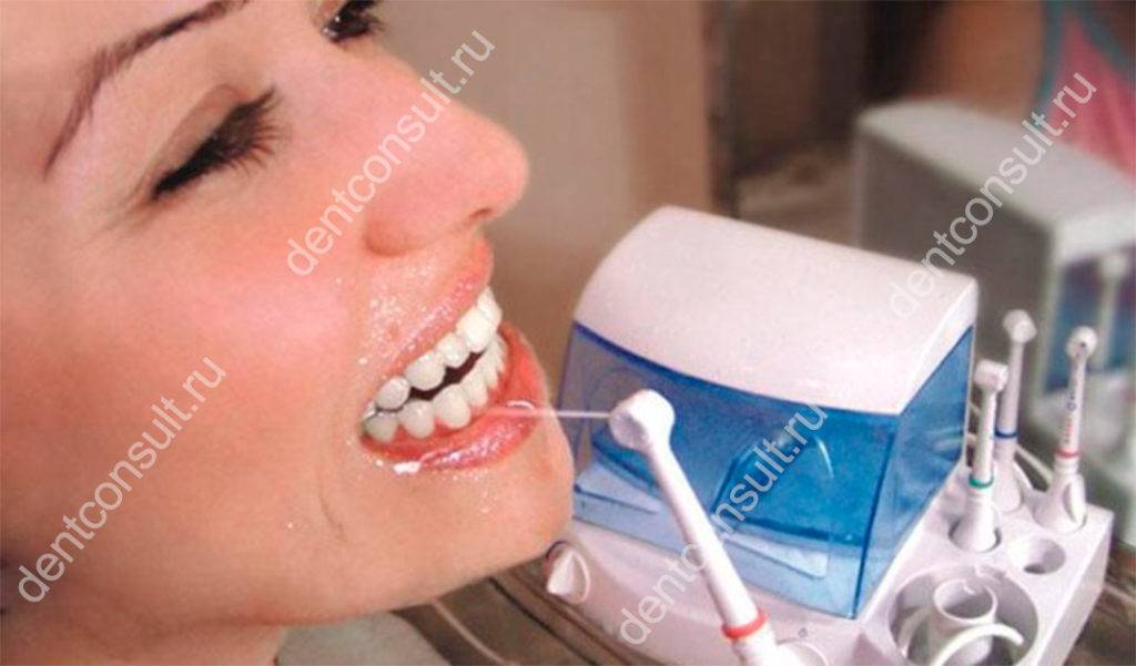 Для того, чтобы во время чистки избежать разбрызгивания воды, необходимо наклониться над раковиной. Для чистки зубов струю направлять перпендикулярно (под углом 90°) передней (вестибулярной) и задней (язычной) поверхностям; для очищения десневой зоны насадку необходимо развернуть так, чтобы наклон струи составлял 45° к поверхности зуба.