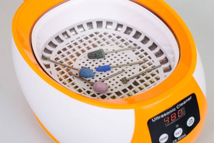 - Ультразвуковой стерилизатор. В основе работы использовано воздействие ультразвуковых волн. В рабочую камеру наливается антисептический раствор. В процессе работы ультразвуковые волны создают вибрацию, появляются пузырьки, которые лопаются и уничтожают бактерии и вирусы. Прибор универсален и подходит для использования дома и в салоне. Также в нем можно дезинфицировать пластиковые предметы. К недостаткам относится высокая стоимость и, дополнительный расход на обеззараживающую жидкость. К тому же, с некоторыми вирусами такой способ не справится.
