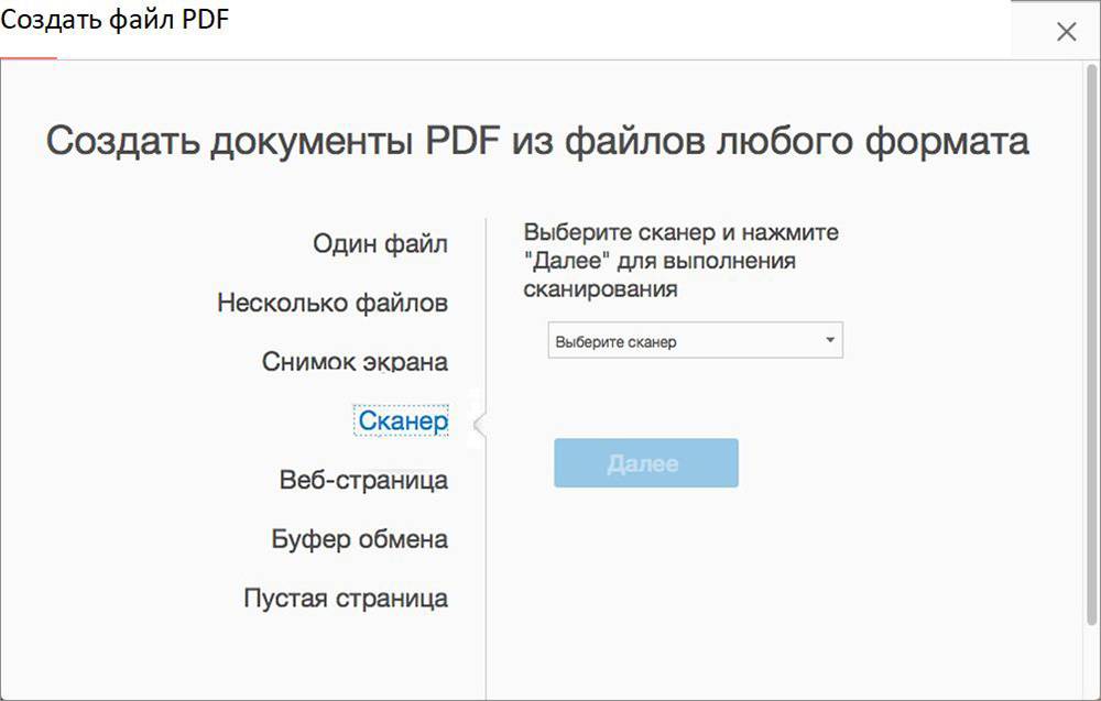 Формат PDF бумажного документа создается при выборе «Создать файл PDF» на вкладке «Инструменты». Затем появится интерфейс «Создать PDF-файл из любого формата файла», в котором надо выбрать элемент «Сканер», чтобы отобразить доступные параметры.