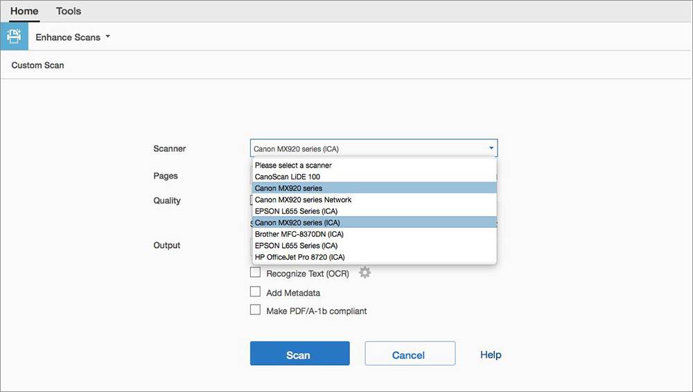 Стандартная процедура требует использования принтера и программы Acrobat. Она поддерживается на Windows, с помощью драйверов TWAIN, а также Windows Image Acquisition (WIA).