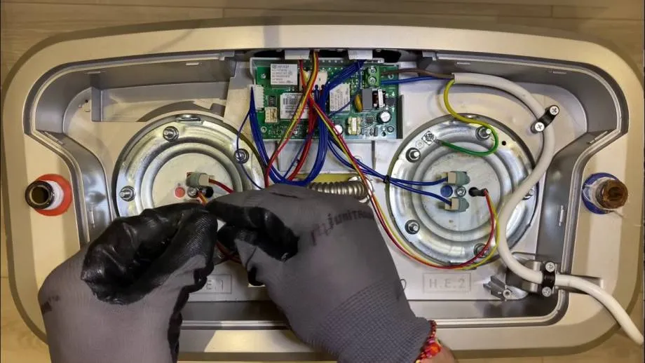 - После очистки ТЭНа и бака следует собрать бойлер — всё происходит в обратной последовательности. Главное — надёжно прикрутить соединительные винты и гайки, установить терморегулятор, использовать обмотку для труб, подключить провода;