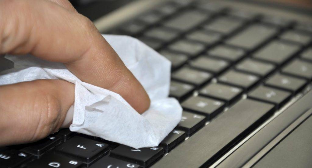 Для чистки и ухода за корпусом ноутбука также отлично подойдут салфетки с бактерицидной жидкостью. Они очень просты в использовании – достаточно аккуратно провести ими по клавишам, и бактерии и грязь исчезнут. Недостатком использования влажных салфеток является то, что они не позволят хорошо очистить внутренняя часть клавиатуры, но это, безусловно, поможет нам сохранить ее в чистоте.