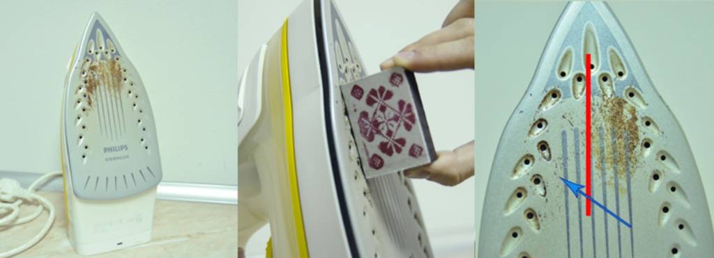 При таком способе очистки важно следить, чтобы расплавленное вещество не попадало в отверстия для пара, так как это может вызвать их засорение и привести к порче прибора. После обработки на утюге остается след от карандаша, который легко удаляется при проглаживании чистой ткани (ветоши, тряпки)