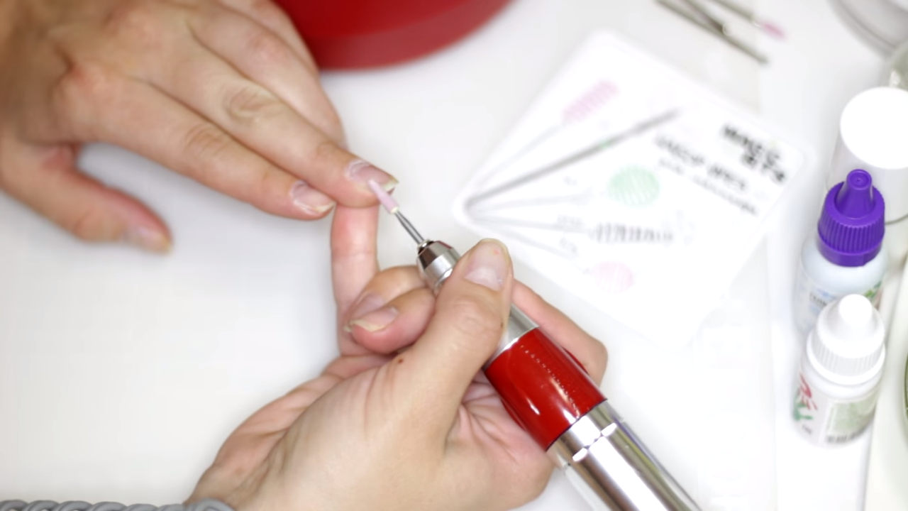 - Насадку на маникюрном фрезере меняют на бор и истончают кутикулу. Наконечник ведут только по коже в одном направлении.Шариком бора при обработке кутикулы нельзя касаться самого ногтя