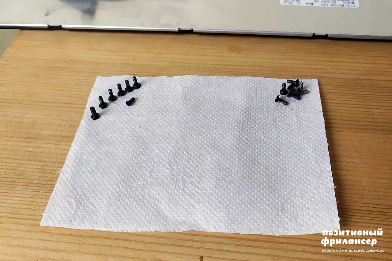 Теперь можно раскручивать заднюю крышку. На многих моделях лэптопов используются винты разных размеров, поэтому стоит сфотографировать или, ещё лучше, записать на видео, где какие винты. Все винтики стоит складывать по размеру или секции, откуда они были выкручены. Так, кстати, делаю я.