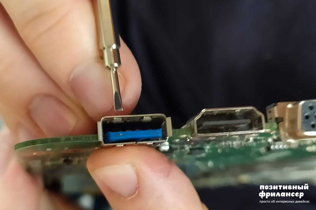 Теперь необходимо всё собрать обратно. Пользуясь случаем, я немного подогнул USB-разъёмы.