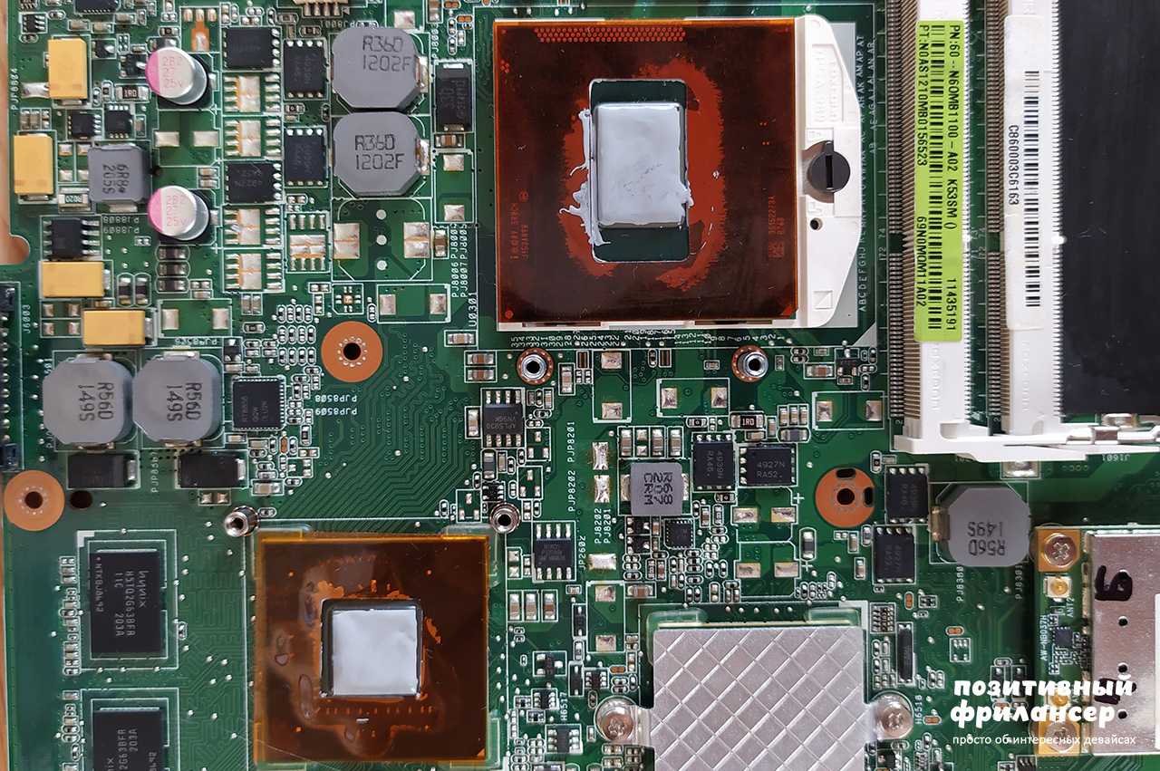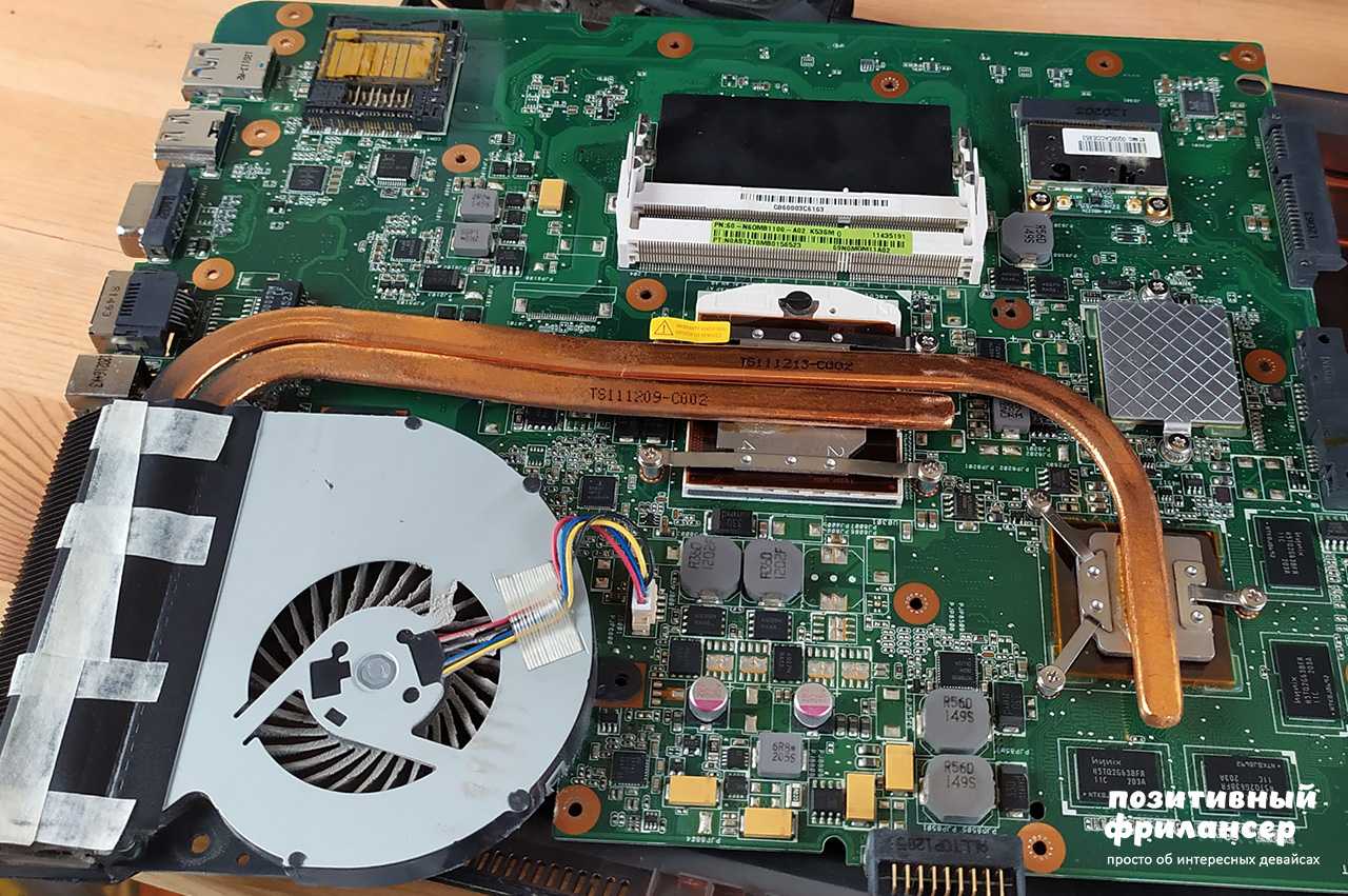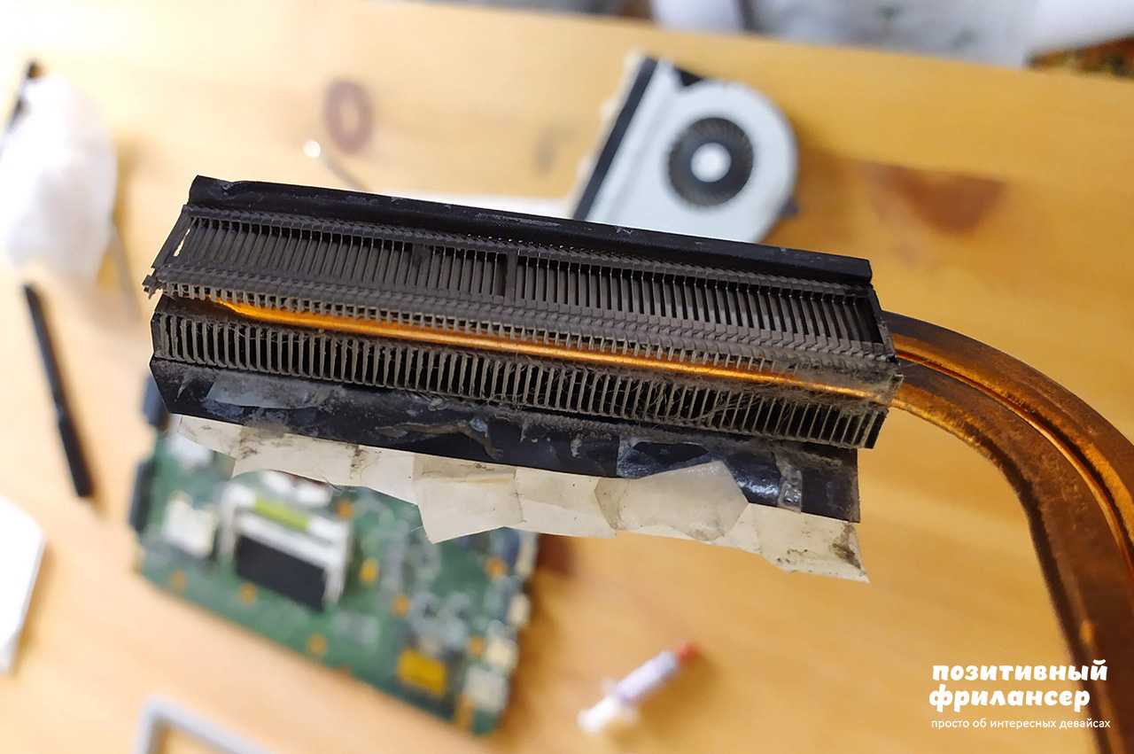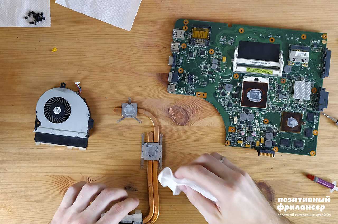 Чистка ноутбука не ограничивается протиркой материнской платы от пыли. Грязь может скапливаться на процессоре и видеокарте. Кстати, если вы уже разобрали ноутбук, проверьте, не высохла ли термопаста.