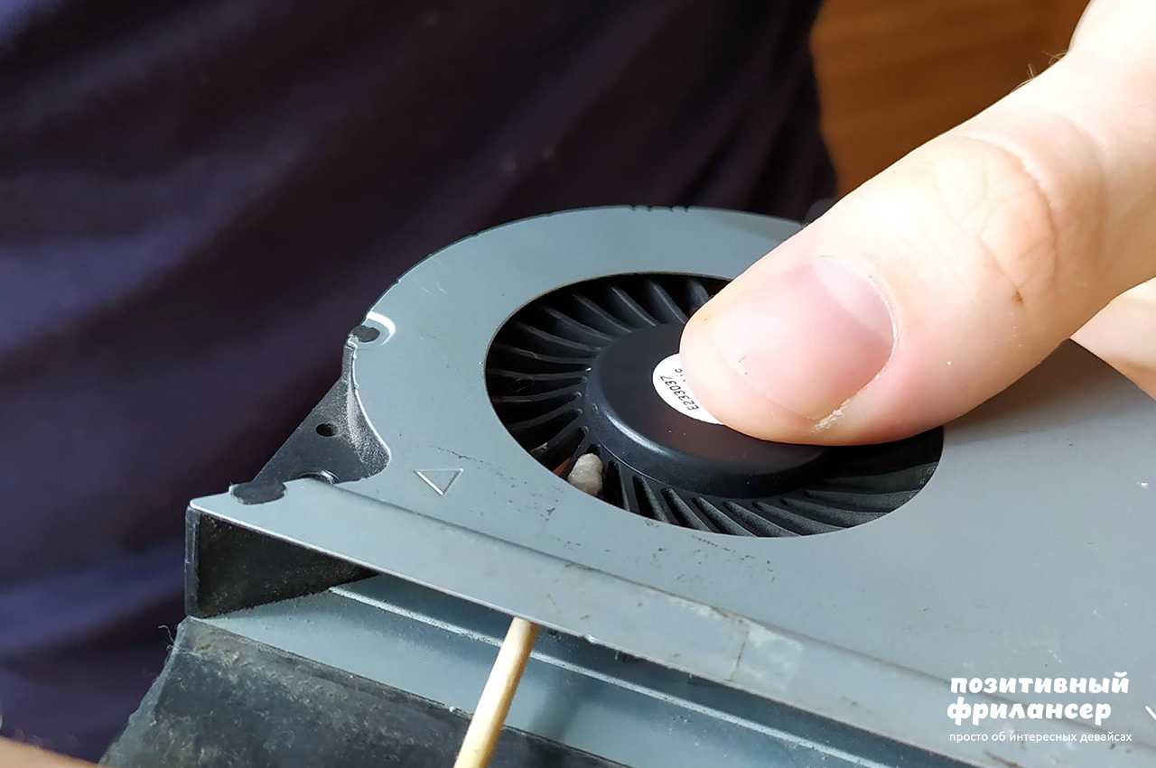 - Очистите вентилятор от грязи ватной палочкой, смоченной в спирте, вставляя её между лопастей и удаляя пыль.