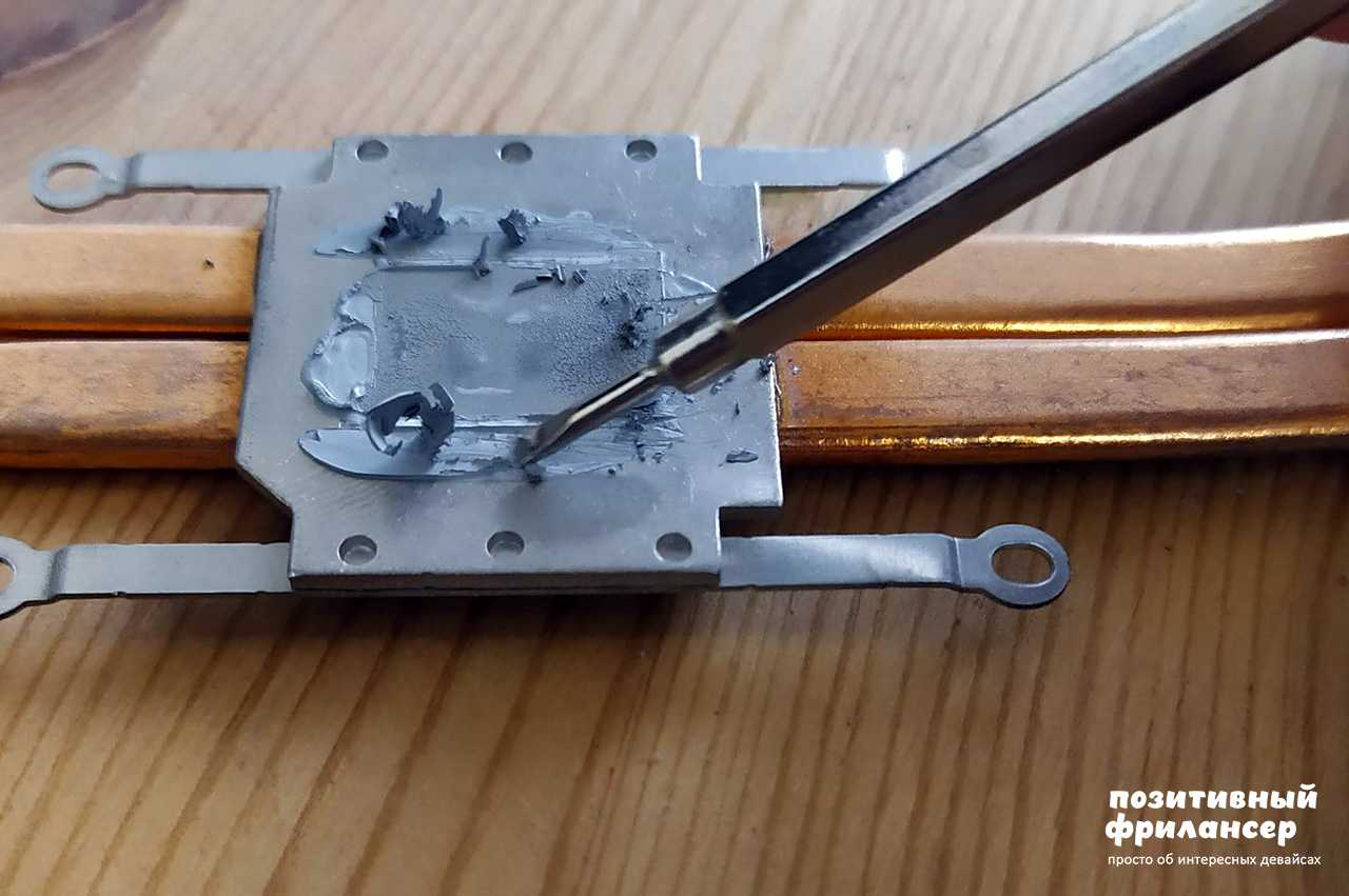 Аккуратно счищаю её от охлаждающей поверхности. Рекомендую делать это при помощи влажной салфетки. Я с дуру полез чистить маленькой отверткой, в итоге немного поцарапал поверхность.