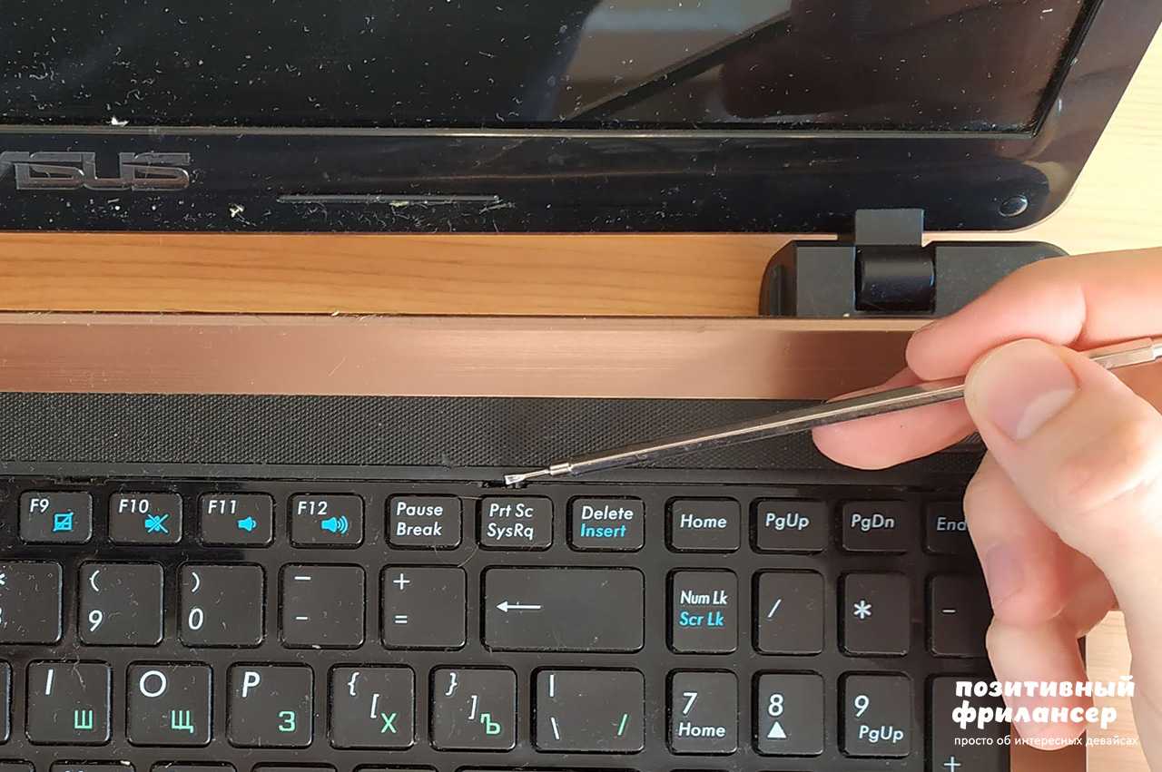 Далее следует аккуратно извлечь клавиатуру. В моём случае она крепится классическими защёлками, к которым не очень удобно подлазить. Вообще сейчас моя клавиатура не совсем совпадает с оригинальной. Дело в том, что она уже по моему четвертая по счёту на этом ноуте) В некоторых моделях она крепится винтами изнутри, нужно гуглить свою модель.