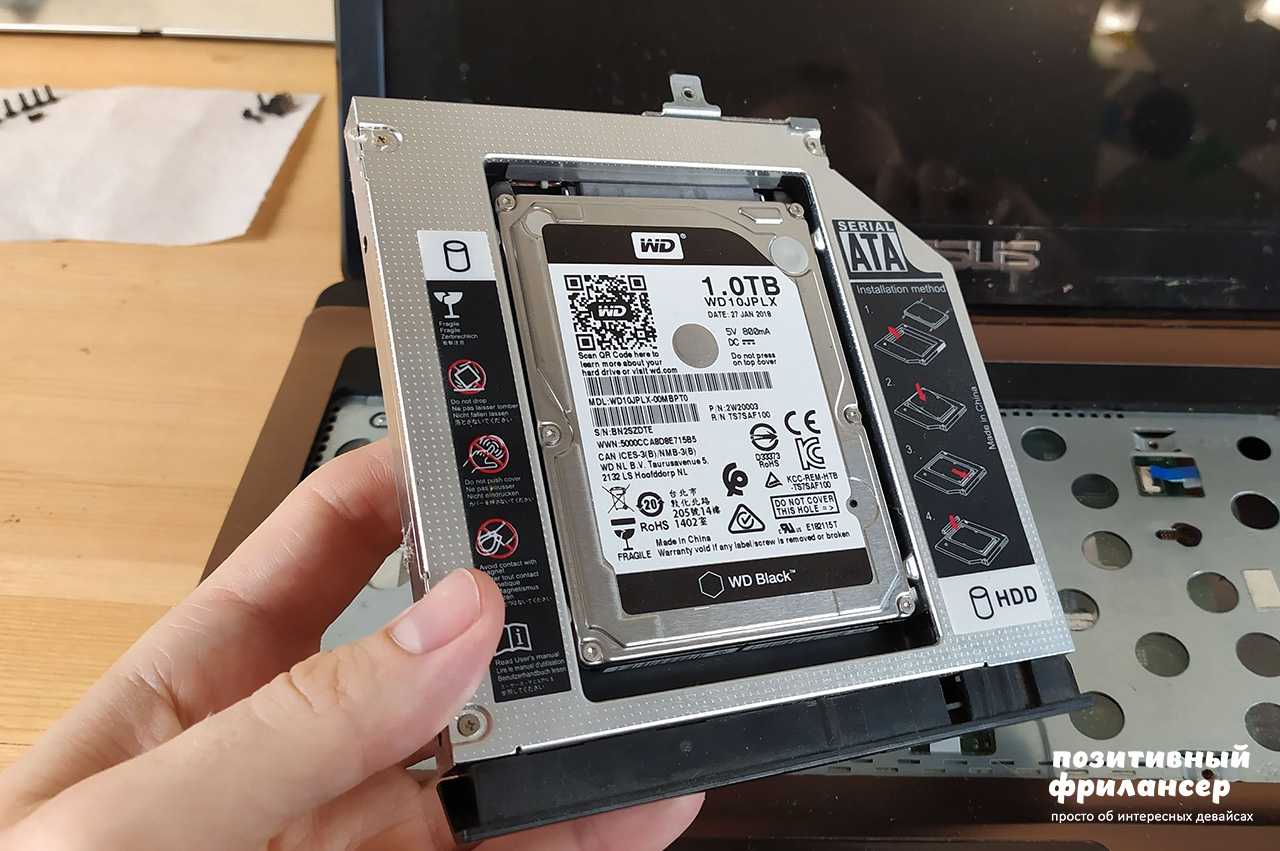Второй накопитель я тоже снимаю. Вообще, здесь раньше был DVD-привод, но кто вообще сейчас пользуется DVD?) Несколько лет назад я заказал вот такой переходник в виде привода, в который вставляется накопитель. Я решил, что начну апгрейдить лэптоп, установив SDD + HDD.