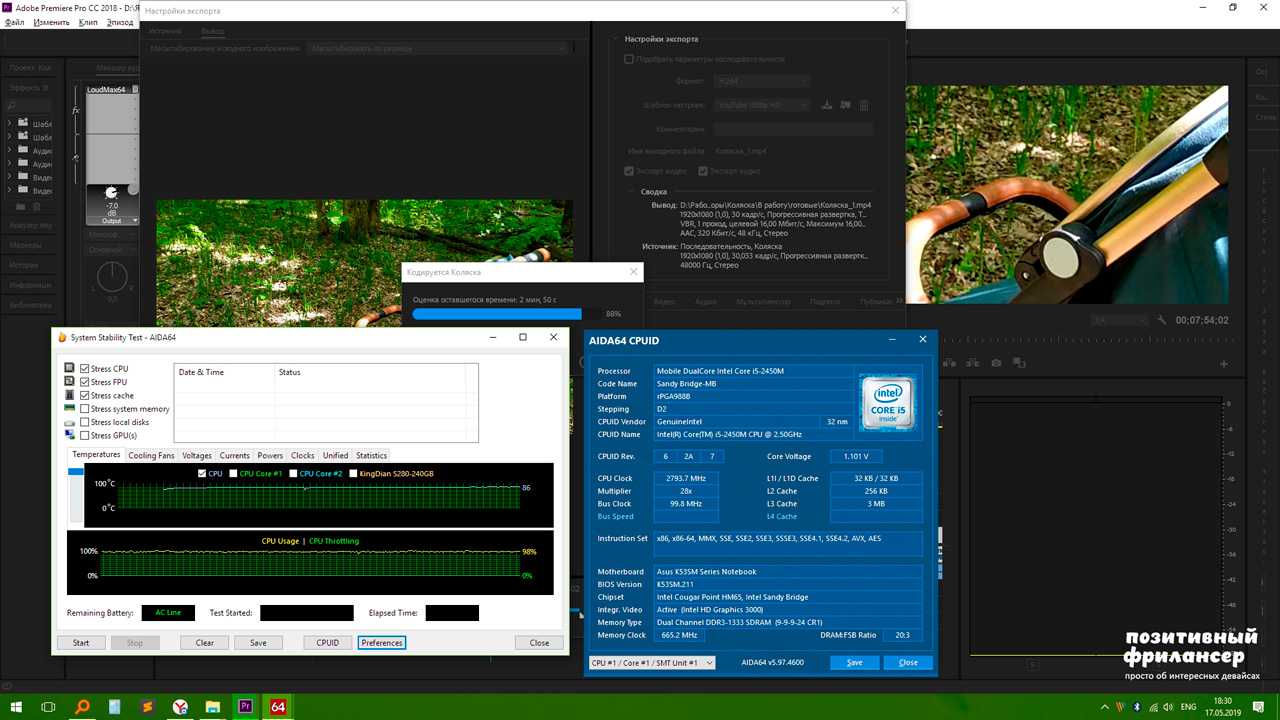После сборки, я решил как следует натереть внешнюю часть ноута. Скопилось много пыли на клавиатуре и дисплее. Почистив всё, я его запустил. Как видно на графике, температура снизилась на 10°. Теперь, при максимальной нагрузке на ЦП, температура не превышает 86°, что вполне приемлемо.