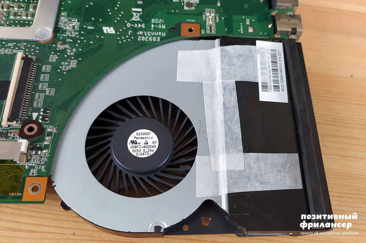 Т.к. ноутбук вскрывался не в первый раз, то заводская защита кулера от пыли уже не держится. Пришлось немного заморочиться и склеить всё малярным скотчем. В принчипе проблемы нет.