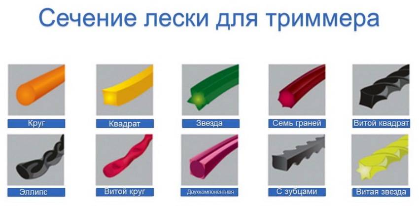 Видов лески очень много, на цвет внимания можно не обращать – как таковых общих стандартов «цвет-характеристика» нет. Важным фактором становится тип сечения струны, его выбирают в зависимости от вида травы.