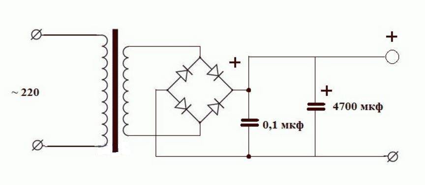 Лица, имеющие представление об электротехнике, могут изготовить самодельный блок питания. Схема его довольно проста и включает понижающий трансформатор, диодный выпрямитель и два конденсатора. Все детали можно купить или взять из старой радиотехники. Подойдет трансформатор от лампового телевизора с выходом 24–30 В. Наличие выпрямляющего диодного моста обязательно. Конденсаторы применяются недефицитные, от старой техники: один на 0,1 мкф и другой электролитический на 4700 мкф.