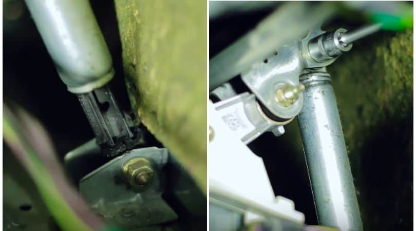 Для проверки амортизаторов необходимо открутить нижний болт, на котором он крепится к корпусу.