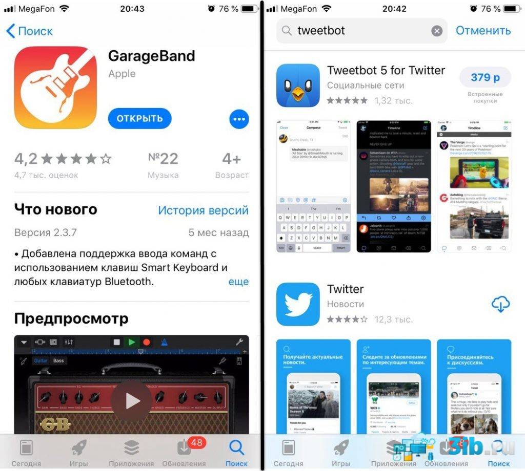 Заходим в Apple Store и в поиске вбиваем любое название, например, Tweetbot 4 или GarageBand (эти приложения есть только на iOS);