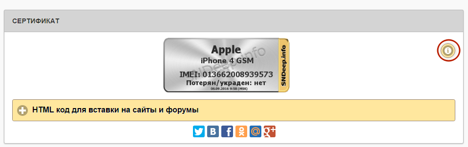 - Отобразится страница, на которой будет сертификат подлинности аппарата. В нем указана следующая информация: бренд, модель, потерян или украден гаджет.