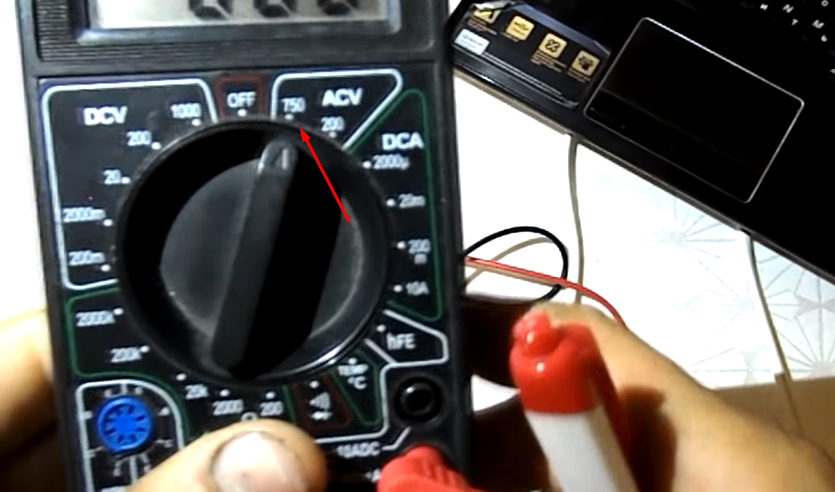 Последовательность действий для замера переменного напряжения аналогична измерению переменки. Единственное отличие — это то, что выбирать предел измерений необходимо в секторе ACV. Для проверки напряжения в обычной розетке переключатель выставляется напротив числа выше 220 (это может быть 600 или 750).