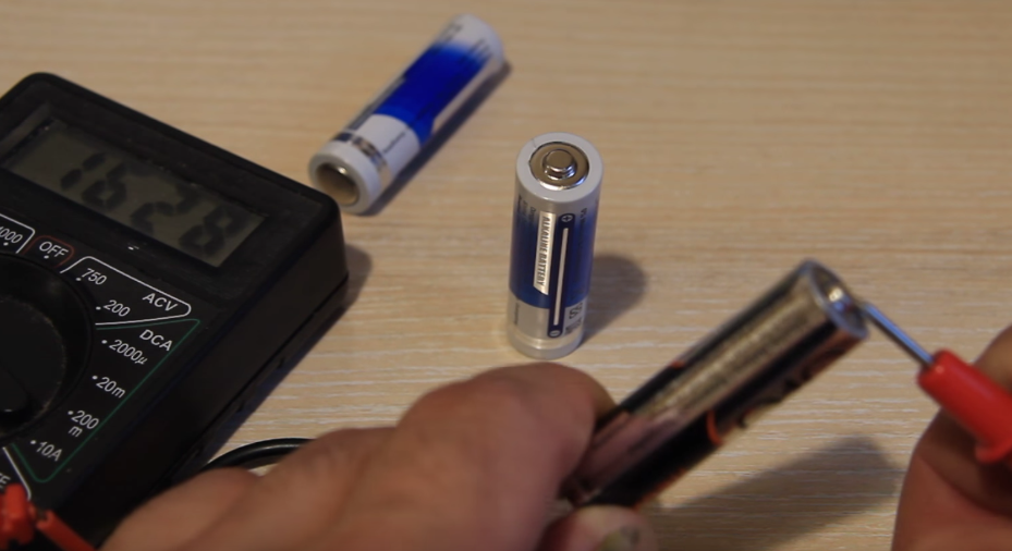 - Размещаем щупы на батарейке с учетом полярности: черный — к минусу, красный — к плюсу, и смотрим на результаты.
