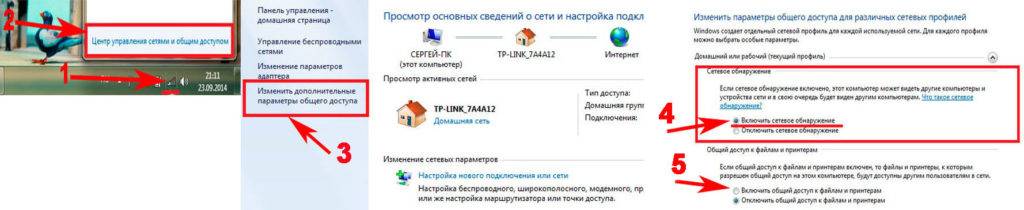 Далее в разделе «Изменить дополнительные параметры…» поставьте точку «Включить сетевое обнаружение». По желанию можете активировать возможность предоставления доступа к вашим файлам и устройствам.