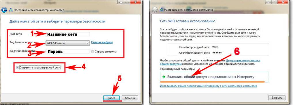 Далее вводим параметры будущей вай фай сети. Имя сети — вписываете любое название. Тип безопасности – можно поставить «WPA2 — Personal». Ключ безопасности — вбиваем пароль и запоминаем его, он понадобиться во время подключения к вашему ноутбуку. Не забываем в самом низу отметить галочкой «Сохранить все параметры». Жмем «Далее». Появиться еще одно окно, где требуется клацнуть на пункте «Включить общий доступ к ….».