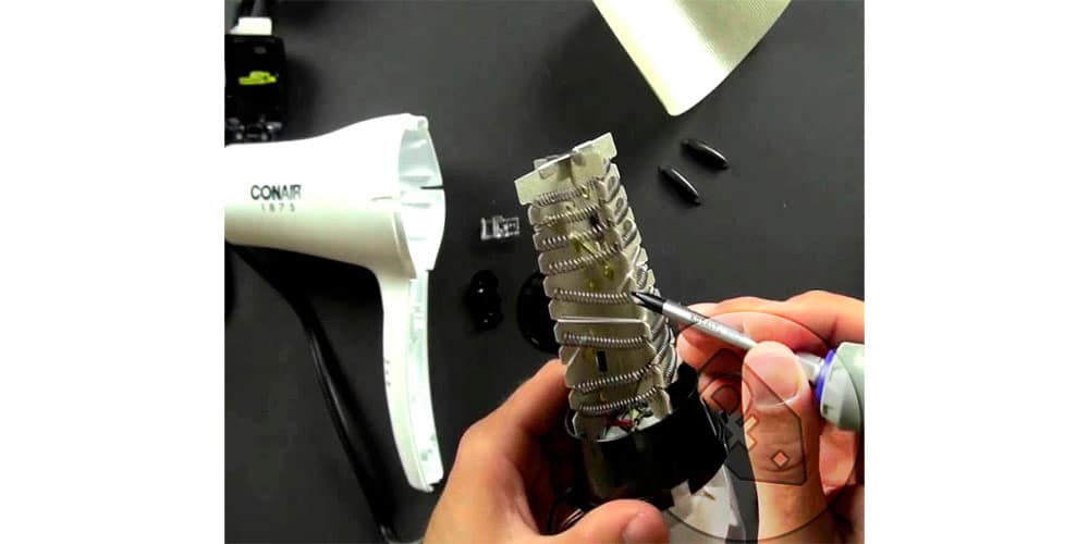 Нагревательный элемент фена представляет собой каркас из несгораемого материала с несколькими обмотками из нихромовой проволоки (спирали). В зависимости от количества режимов работы фена, обмоток может две или три, одна из которых понижающая.