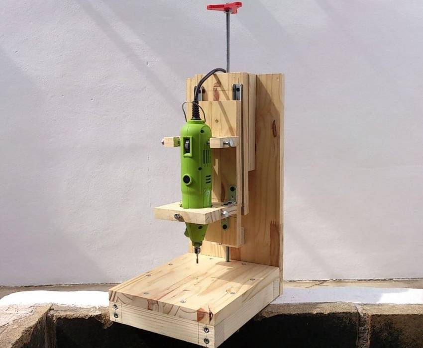 В зависимости от габаритов электродрели изготавливают стойку необходимого размера и крепят её к основанию саморезами или мебельными конфирматами.