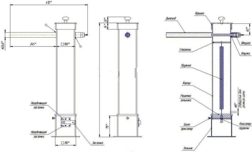 - дымовой канал — труба, посредством нее дым остывает и подаётся в камеру готовки;