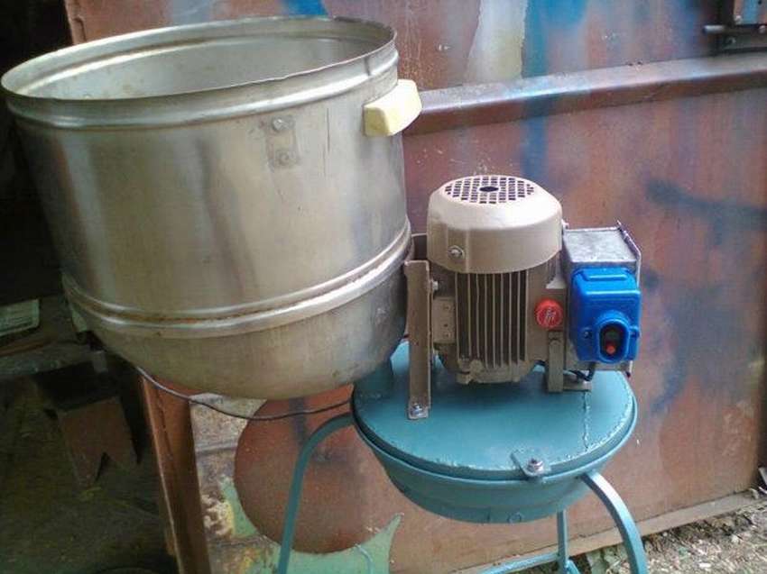 Один из возможных вариантов сеноизмельчителя, сделанного своими руками. Мотор можно взять от ненужной техники. В качестве бункера можно использовать бочку. Измельчение будет происходить за счёт ножей, которые можно реквизировать у кухонного комбайна. Останется только найти ровный вал и сварить несколько труб для опоры.