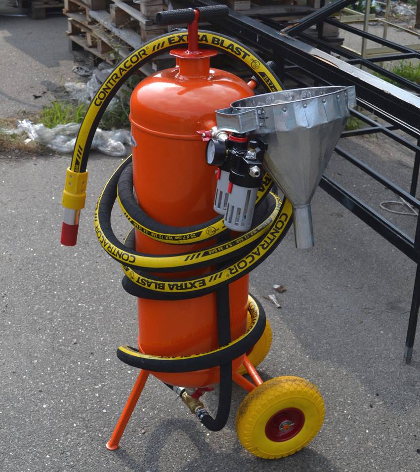 - пескоструйки пневматического типа. Они имеют огромные мощности и давление в емкости, так как рассчитаны на обработку запущенных деталей или большой по площади поверхности. Аппараты такого типа можно даже не пробовать собирать самому.