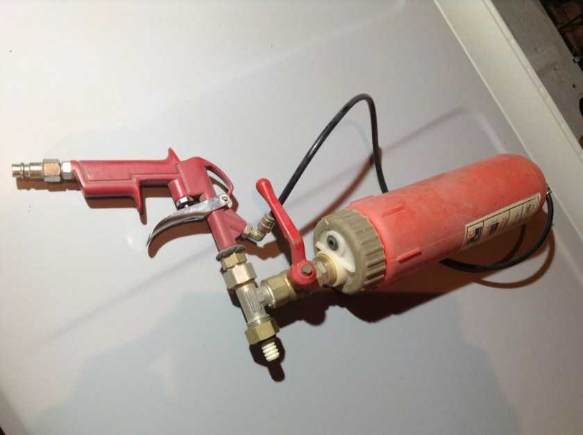 Изготовить пескоструйный аппарат своими руками из огнетушителя пошагово можно по простой инструкции. Баллон для работы лучше брать повместительнее, поскольку приспособление в таком случае получится мощнее.