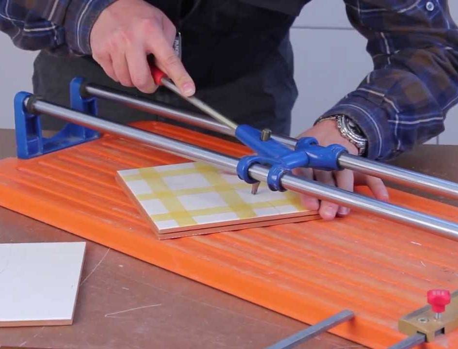 Лезвие устанавливается таким образом, чтобы при фиксации он доставал до кафеля и мог свободно прочертить линию разреза. При нажатии плитка зафиксируется на платформе, затем с помощью ручки потяните режущий элемент и доставайте разрезанный кафель. Таким образом, сохраняется принцип действия производственной модели.